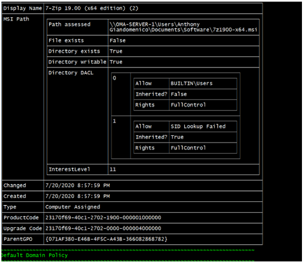 您可以看到我配置了一个 7zip 的 MSI 软件包进行安装。虽然该文件不再存在,但它仍然有权写入指向的目录。这意味着攻击者可以将其恶意有效负载名称更改为 7z1900-x64.msi,并将其复制到该特定路径,从而在此策略应用的每台设备上加载并执行恶意有效负载。