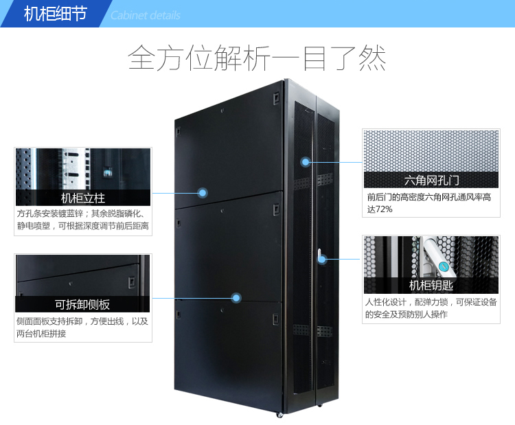 - 外观高贵典雅,工艺精湛、尺寸精密,媲美国际最高档网络服务器机柜,彰显优质机房工程形象;
