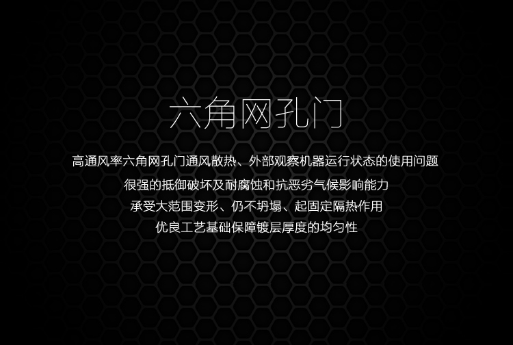 - 高通风率平板六角网孔前门和双开平板六角网孔后门,一揽子解决机械保护、通风散热、外部观察机器运行状态三方面的使用问题;